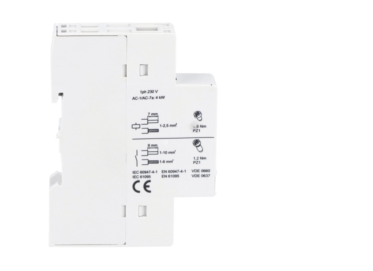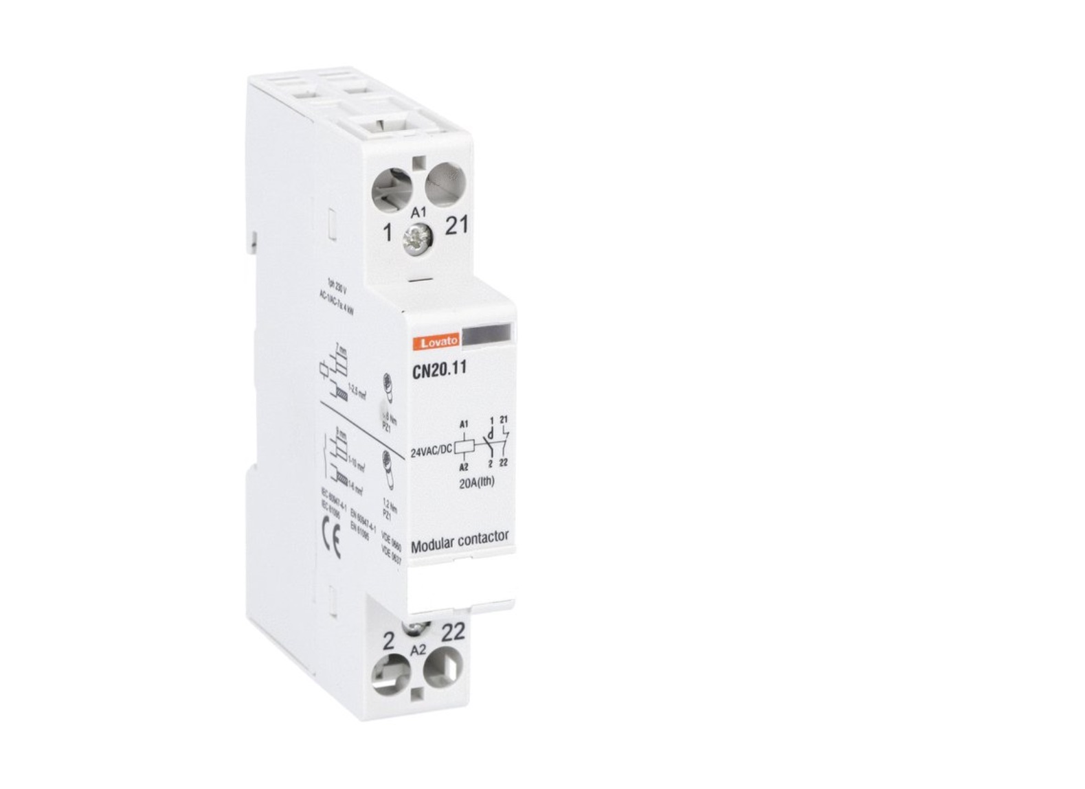 Popis:Instalační stykače, Jednopólové nebo dvoupólové, 20A AC1, 24VAC/DC (1Z+1V)