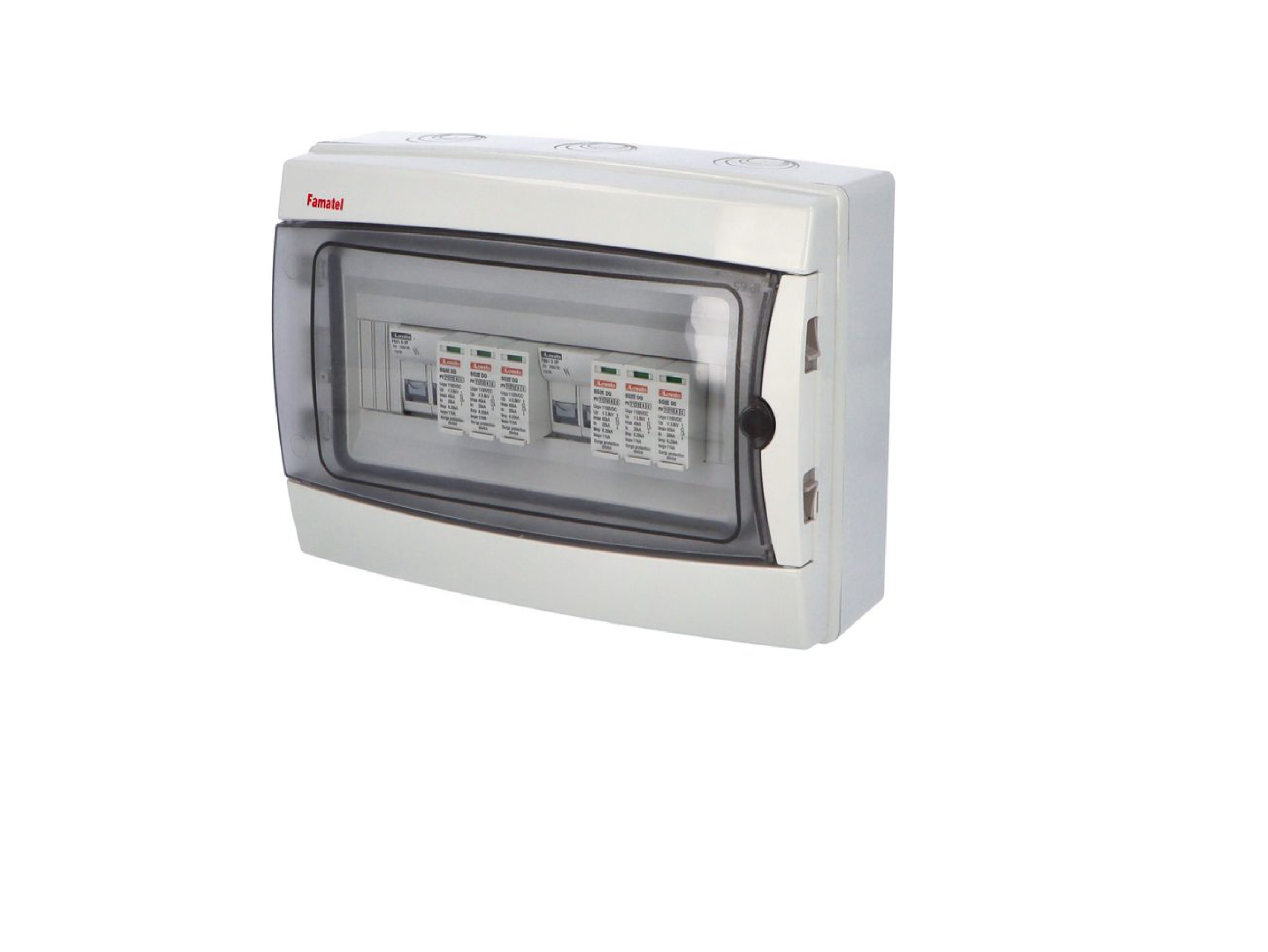 Popis:Fotovoltaická rozvodnice Famatel, IP65 chránící DC vedení o max. napětí