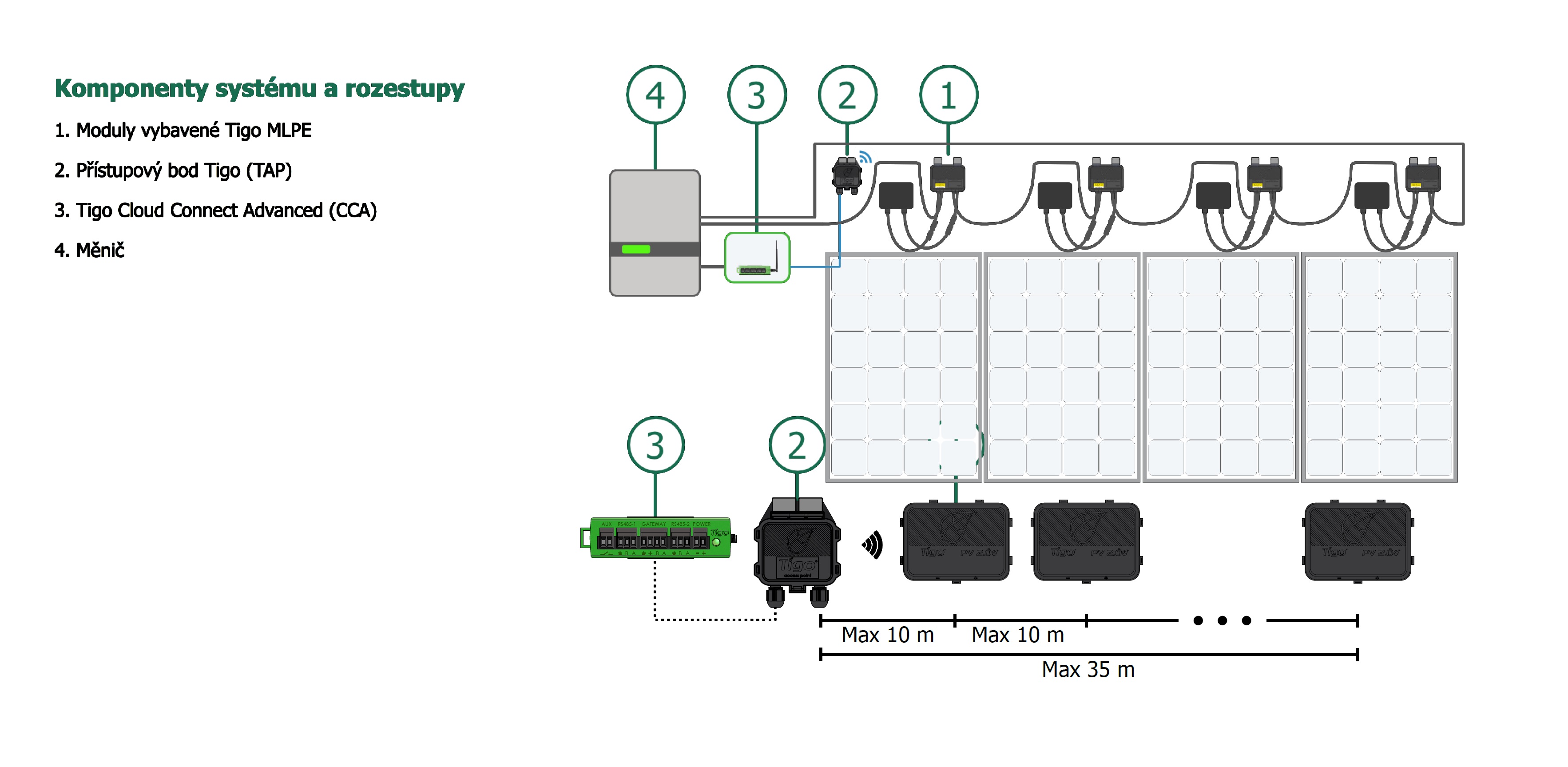 Max. vzdálenost od přístupového bodu TAP k nejvzdálenějšímu TS4: 35m