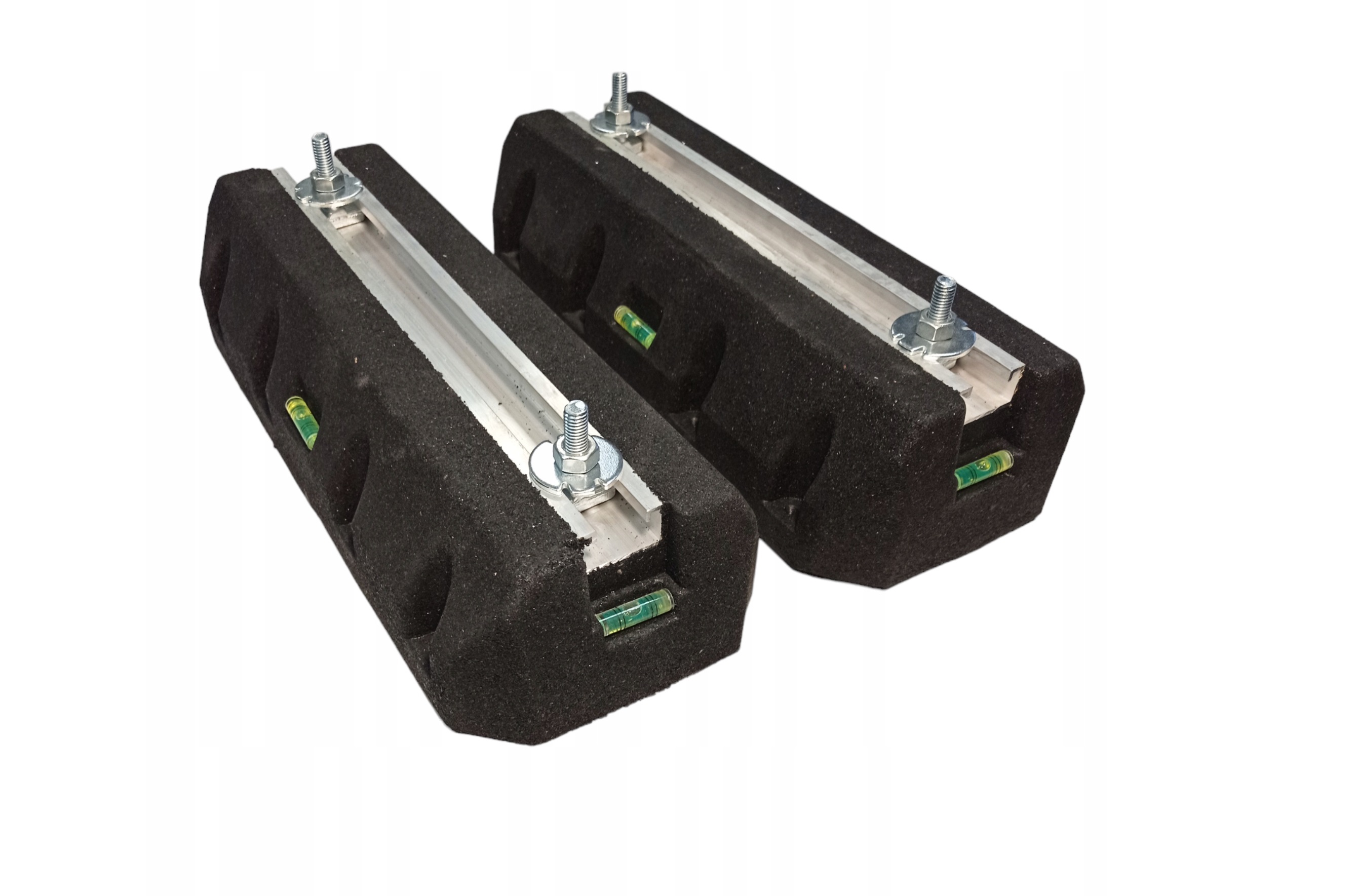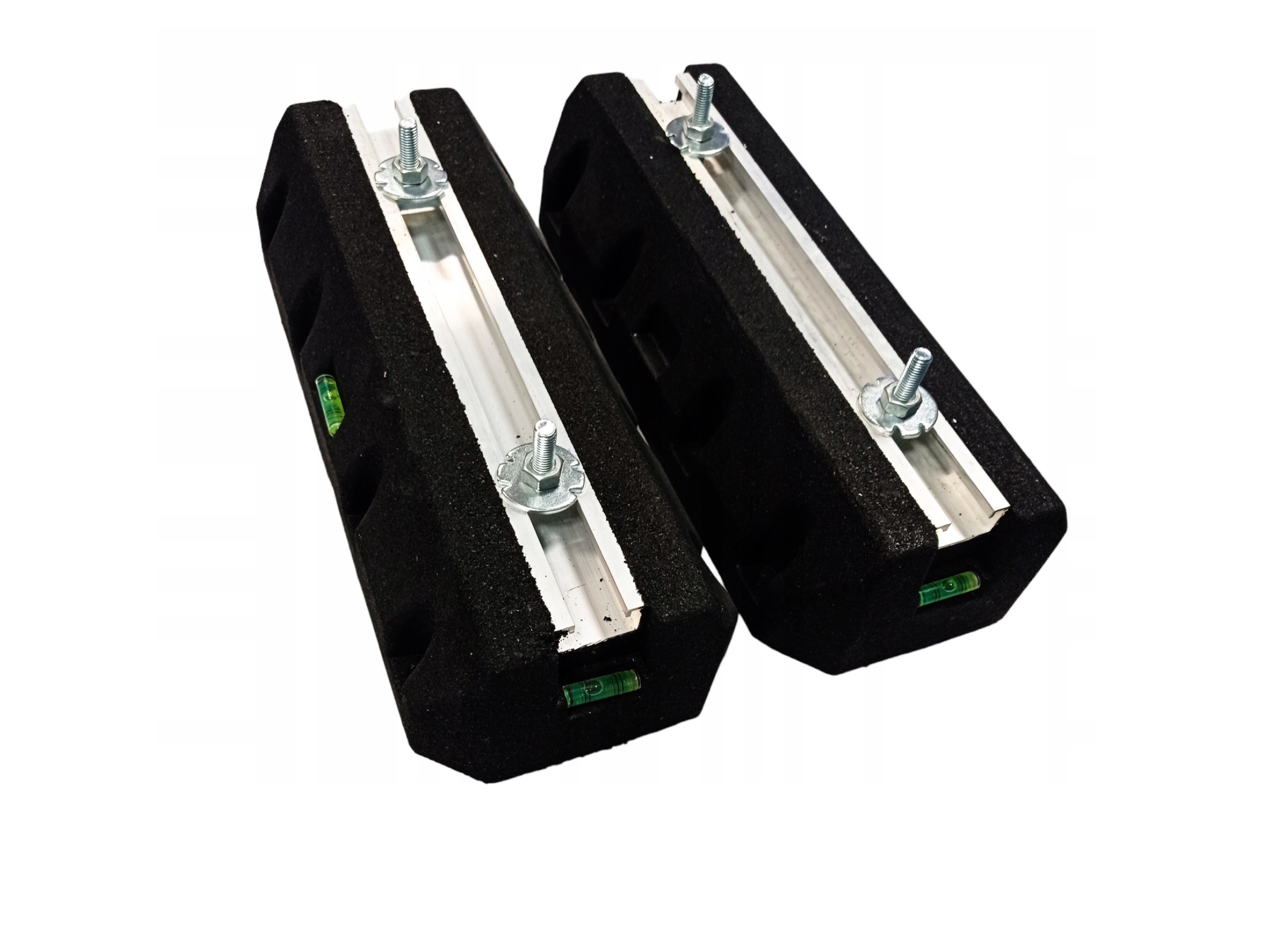 Podpěra zajišťuje rovnoměrné rozložení hmotnosti. Gumová základna je vyrobena z vulkanizované směsi SBR, odolné vůči UV záření, která zajišťuje tlumení vibrací. Standardně je součástí kompletní žlab z extrudovaného hliníku, který umožňuje snadnou montáž a demontáž. Výrobek je dodáván včetně upevňovacích šroubů.